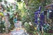 The garden itself is open during daylight hours, though visitors are reminded that it is the artists' home. Mosaic pathways lead the way between palms and dense Florida greenery. Sculptures made by folk artists, tiki carvings and other surprises peek out from the flowers. Bottle trees reminiscent of other art environments gleam in the sun. A gazebo salvaged from a historic restaurant at the center of the garden is used as an open-air craft workshop. Oversized flowers made from recycled plastic drink bottles are a remnant of a Christmas display theme of recycling. The exuberant bright colors and clutter fit right in with the tropical density of the garden.