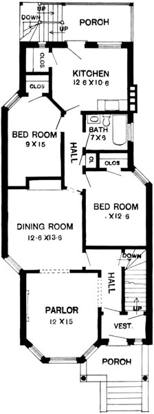 Other than the stone facing, the rear and interior of these houses is similar to a brick two-flat. Most often, the front door opens to a small shared hall or vestibule with doors to first and upper-floor apartments. In the original layout, the front of each apartment is usually a large living room, or "parlor" as in the 1909 floor plan below. Several bedrooms and small bathroom are in the center of the building. The kitchen is usually at the rear, with a door to the back porch.