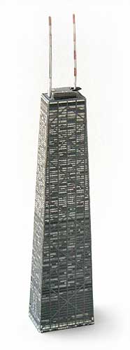 1:4000 scale miniature paper model, about 4.5 inches tall when built Since 1969 this building has been one of the most recognizable monoliths of the Chicago skyline. The sloping sides of the 100-story, 1127-foot tower are designed to deflect strong winds. Unlike many other skyscrapers the John Hancock Center is a multiy-use structure: combining offices, shops, apartments and parking in one building as a self-contained urban village. The John Hancock Center is the fourth-tallest building in Chicago after the Sears Tower, Trump Tower and AON Center. Read more: