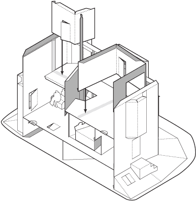 Glue the laboratory interior walls inside the belvedere rooftop, and then glue the eaves of the belvedere rooftop to the inward tabs of the laboratory floor. |