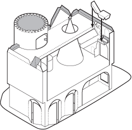 Finally, glue the roofs to the towers and then add the roof spires. Add the pine tree to the base. Glue the chimney to the rooftop. The closed chimney is simply glued to the top of the roof. The open chimney is fitted through the hole in the roof and should line up inside the fireplace chimney. Drop a few gift boxes down the chimney to test the alignment before the glue dries. |