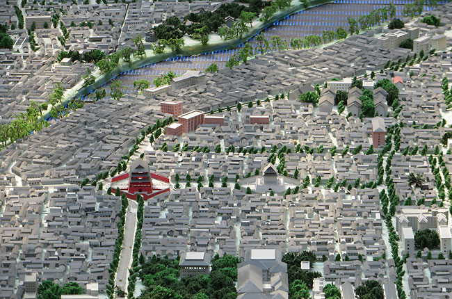 The low sprawl of hutong housing in various parts of the city is not depicted with much detail. Are there really so many trees planted along these small streets? While the traditional alleys and courtyard houses were built by a rough pattern to orient toward the southern sunlight, the clusters of tiny buildings on the model seem arbitrary and probably do not correspond with the real structures on the ground. Elsewhere in the museum there are excellent exhibits which explain in great detail Beijing's unique development of narrow hutong alleys and siheyuan courtyard houses which cluster around a shared well, so its a shame that the large city model is so imprecise in detail in these areas. The urban planners of Beijing have been much criticized by historic preservationists for demolishing as much as 70% of the old-style hutong neighborhoods of the city in the last 20 years. Perhaps the generic buildings of the model show a lack of appreciation for these areas.