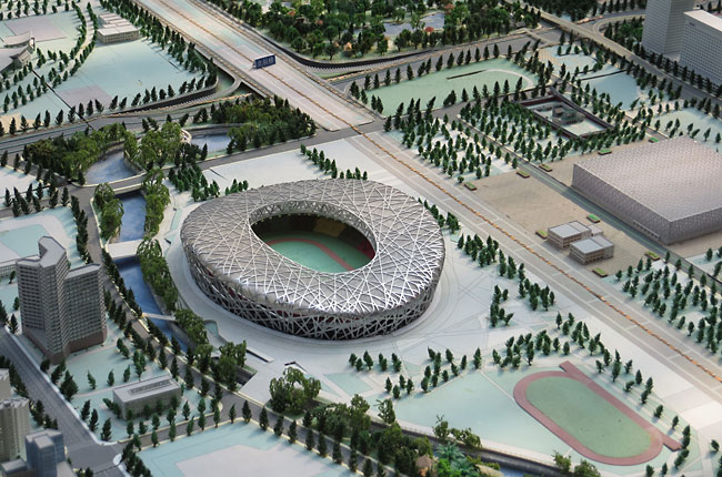 Publicity and marketing for the 2008 Olympics were an important function of the city model when it opened in 2004, similar to the Pipers London model from 2008. The Birds Nest stadium and Water Cube aquatics center are at the north edge of the model, with the road in the center in line with the north-south axis through the Forbidden City to Tiananmen Square seen in the second and third photos at the top of the page.