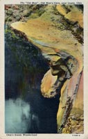 Reverse: OLD MAN'S FACE AND DEVIL'S FOOTPRINT On the face of the Lower Falls at Old Man's Cave and easily visible from above, is a profile of an old man. Above this profile is a definite footprint made in the Black Hand stone. Located on highway 374 in Hocking State Parks near Logan, Ohio. Publisher: Hivnor Card Co., Zanesville, Ohio MNM#01-01333 The old man profile does not appear as "easily visible" as the postcard text claims. It appears the photographer tried to capture both the Devil's Footprint at top as well as the Old Man in the shadow below the ledge, but cropped off most of the Old Man's face below the nose. The formation gazes downward toward a pool from beneath a sandstone ledge on the north edge of Lower Falls. Other views of this formation: A short distance away is Sphinx Rock |
