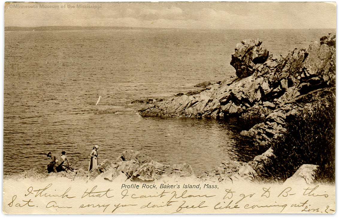 This formation is known variously as "Norseman," "Man of the Sea," or simply "Profile Rock." It is a fully formed head sprouting from the rocky shore just north of the Bakers Island lighthouse.