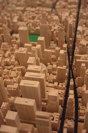 The unpainted wood of the model creates a unity from the jumbled forms of the real city, as if the dense skyscrapers were natural objects growing in a miniature forest.