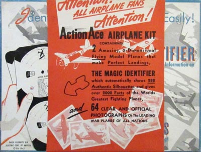 Other ECA toys designed by Reed & Associates published that year included a Ferris wheel and a carousel that used small pieces of glass to make a tinkling sound as they turned. The Skyhawk Squadron Action Airfield featured a cardboard catapult pulled by a string to launch simple airplane models, probably similar to the aircraft carrier model published previously. These complex kits sold for a relatively-expensive $2 each.