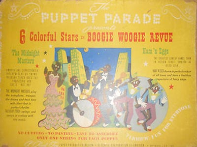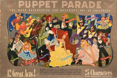 Though Eoina Nudelman didn't get his name printed on the packaging, his artistic style is clearly behind the series of five "Puppet Parade" toy kits made in early 1943. The die-cut cardboard toys included a stand-up stage that fit into the top lid of the box. Children could pull strings to move the cardboard puppets on the stage or make them dance by wiggling the strings. Five toy sets covered five different types of theatrical performance from drama to comedy to music. The storybook-like biographies of the puppet performers printed on the back of the instruction sheet appear to be products of Nudelman's imagination rather than characters who might have already been familiar to children.