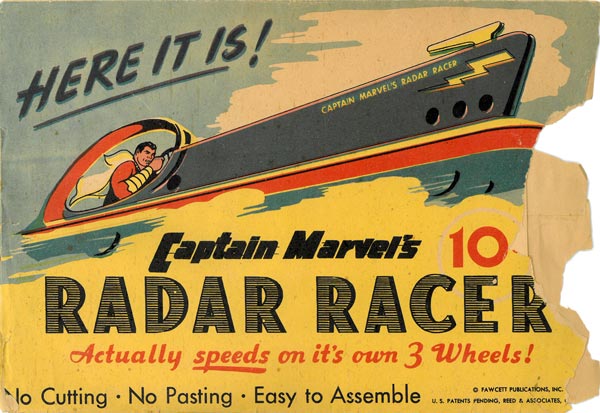 In 1944 Reed & Associates began a new partnership with Fawcett Publications, a publisher of childrens comic books. Again Reed & Associates designed the models, the packaging and die-cuts, while Fawcett handled the printing, production and distribution of the finished products. At the time, Fawcett's Captain Marvel was the most popular comic book character in the United States, selling 1.3 million comic books a month. Reed and Nudelman patented a design for a glider with a fold-up tail, which they customized into several different comic-book super hero paper toys.
