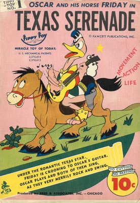 In March 1945 Nudelman patented a toy design which is animated by rocking on a round base. The mechanism became the basis of a new "Tippy Toy" line of cardboard toys featuring characters drawn by artist and animator Chad Grothkopf from Fawcett's "Funny Animals" comic books. The superhero Hoppy the Marvel Bunny was a spinoff from the already popular Captain Marvel stories. Reed & Associates went on to design cardboard games, puzzles, and animated picture cutouts using the Funny Animals in different combinations. The die-cut toys were simple to punch out, but the more complex moving toys may have been a challenge for younger children to assemble.